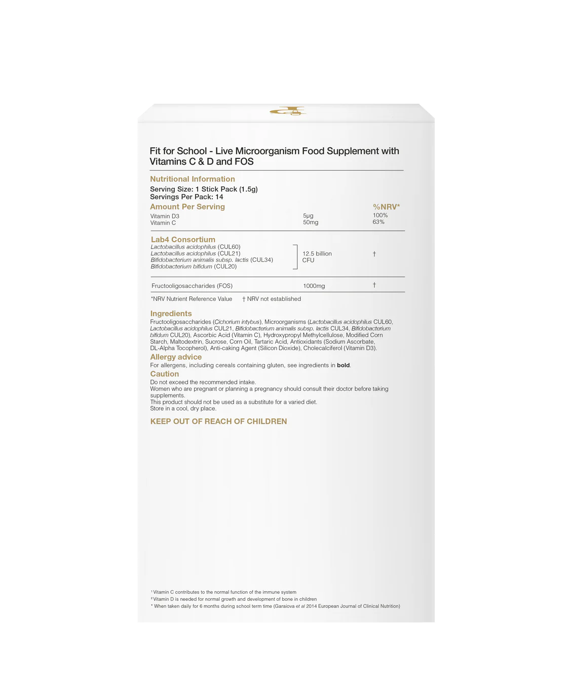 Paketi Fit for School stick, ki so zasnovani posebej za otroke, so posamezne vrečke s praškom, ki so bile razvite z mislijo na otroke. So dovolj sladki, da jih lahko vzamete naravnost v usta, lahko pa jih dodate tudi ohlajeni hrani in pijači ter tako dodate malo sladkosti in veliko dobrega. Z raziskavami podprto vsebnostjo prijaznih bakterij Fit for School vsebuje vsak paketek 12,5 milijarde živih bakterij z vitaminom C in vitaminom D, ki podpirata odpornost. Vsebujejo tudi FOS (fruktooligosaharide), prebiotično vlaknino, ki zagotavlja hrano za prijazne bakterije in je edini vir sladkosti v tem izdelku. Že en sam zavitek palčke vsak dan lahko pripomore k temu, da bo vaš otrok (otroci) „fit za šolo“.