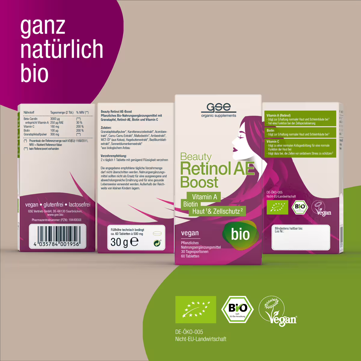 Retinol je trenutno v ospredju vseh, ko gre za lepotno nego. Pravzaprav ne gre za nič drugega kot za vitamin A, ki lahko dejansko veliko naredi za kožo in celice na splošno, tako navzven kot navznoter! Enako velja za vsestranski vitamin C, za katerega večina ljudi meni, da ni „pomemben za kožo“. Po drugi strani pa ste morda že slišali za biotin v kozmetičnem kontekstu. Podjetje GSE je zdaj združilo ta tri hranila in ustvarilo novo ekološko prehransko dopolnilo za lepoto – v skladu s filozofijo izdelka iz izključno rastlinskih virov in v nadzorovani ekološki kakovosti. Sok granatnega jabolka v prahu dopolnjuje formulo.