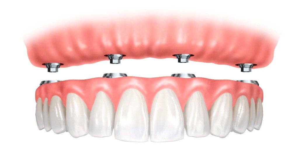 Z naslednjim obiskom se prične postopek vgradnje implantatov za vašo fiksno protezo. Vgradnja implantatov je po postopku sprednjih dveh ravno v čeljust in zadnjih dveh pod kotom. Vgrajujejo se izključno implantati preverjene kvalitete s katerimi imamo dolgoletne izkušnje pri pacientih in ki lahko zagotovijo stabilnost proteze. Implantatio se vgradijo neposredno v jagodičje kosti saj na ta zagotavlja dovolj opore za dolgoročno obstojnost in trdnost. Sledi nadgradnja s posebnimi sidrišči, ki držijo zobno protezo. Sledi izdelava ali priprava obstejoče protetike za fiksiranje.